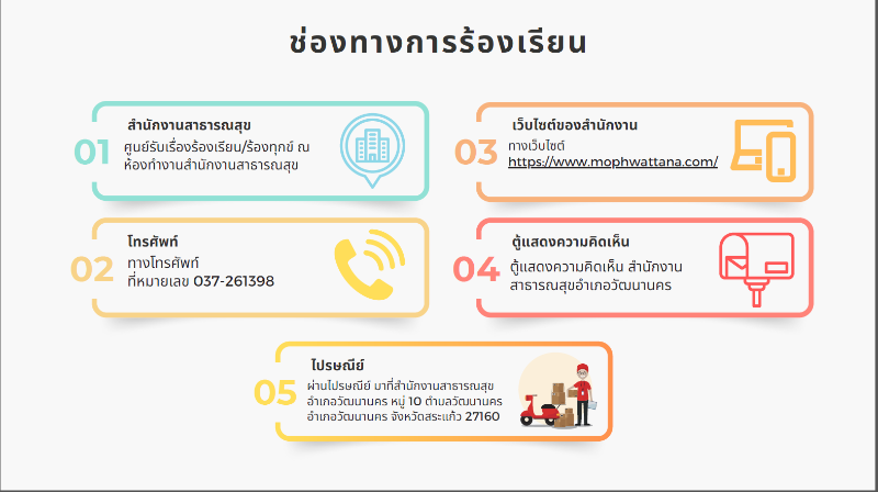 - ช่องทางแจ้งเรี่องร้องเรียนสำนักงานสาธารณสุขอำเภอวัฒนานคร